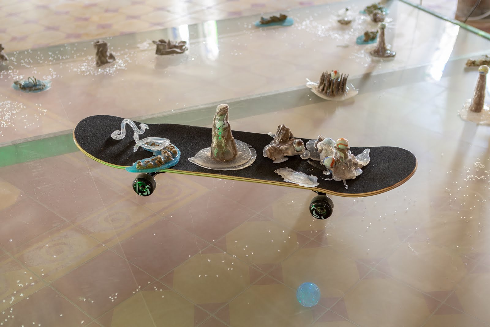 A violet ocean has its bed covered with huge stone balls.Lightnings are striking on the island sticking out of the sea as a horn as it is covered by cast iron rods. From a distance it looks like a sea urchin.