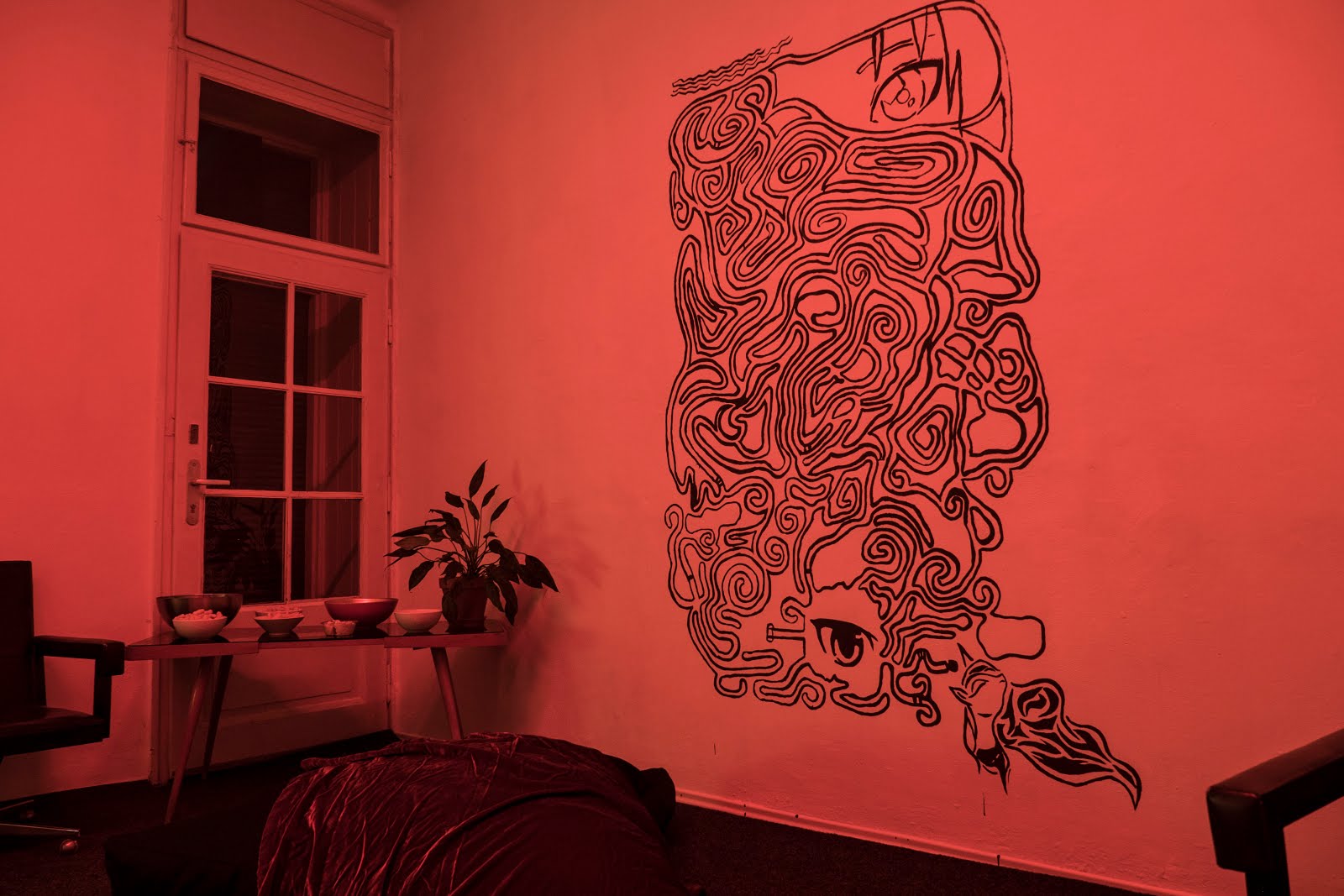 A black line is entering the space, leaves the paper creating abstract patterns tapping into a spiral.