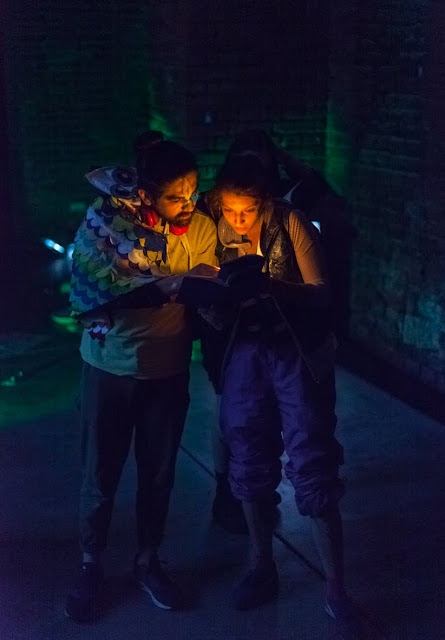 She crosses the footbridge and continues into a long rock corridor where stalactites are hanging. They emanate strange colours. The roaring and cracking sounds have ceased.