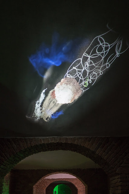 The project of the authors Lucie Mičíková, Nik Timková, Zuzana Žabková and the art historian Lucia Kvočáková called Harvested Darkness created within their “Björnson“ collective renders, above all, a definition of a place. A place in multiple layers and meanings of the word.Their intervention into the premises of the Košice Synagogue embraces not just their creative dialogue but also a place of interconnection where their collective imagination builds further layers.The depth the artists articulate is not physical; it leads to places where the presence could be projected only by shared collective experience.The installation formed by their own architectonic solution, visual elements and projections entices the visitors to immerse into comfortable darkness located elsewhere than the Cartesian bodily presence.It is a place of shared imagination where the heat of togetherness forms a new ecosystem, fruitful humus where the humanistic construct of the subject is melted into a fertile synthesis with the surrounding darkness.
