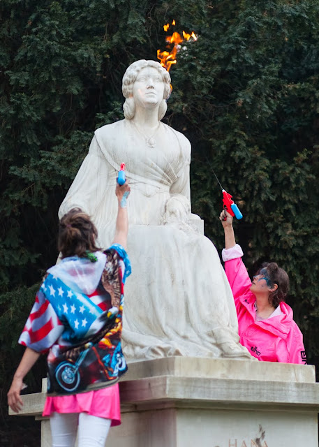 At last she hits a rounded metal rod with her fingers. She halts and keeps fingering the iron until she gets at a handle made of coarse iron. Very swiftly, with all her force, she pulls the rod down. Very loud roaring and cracking resounds and a shower of blueish sparks gushes out.